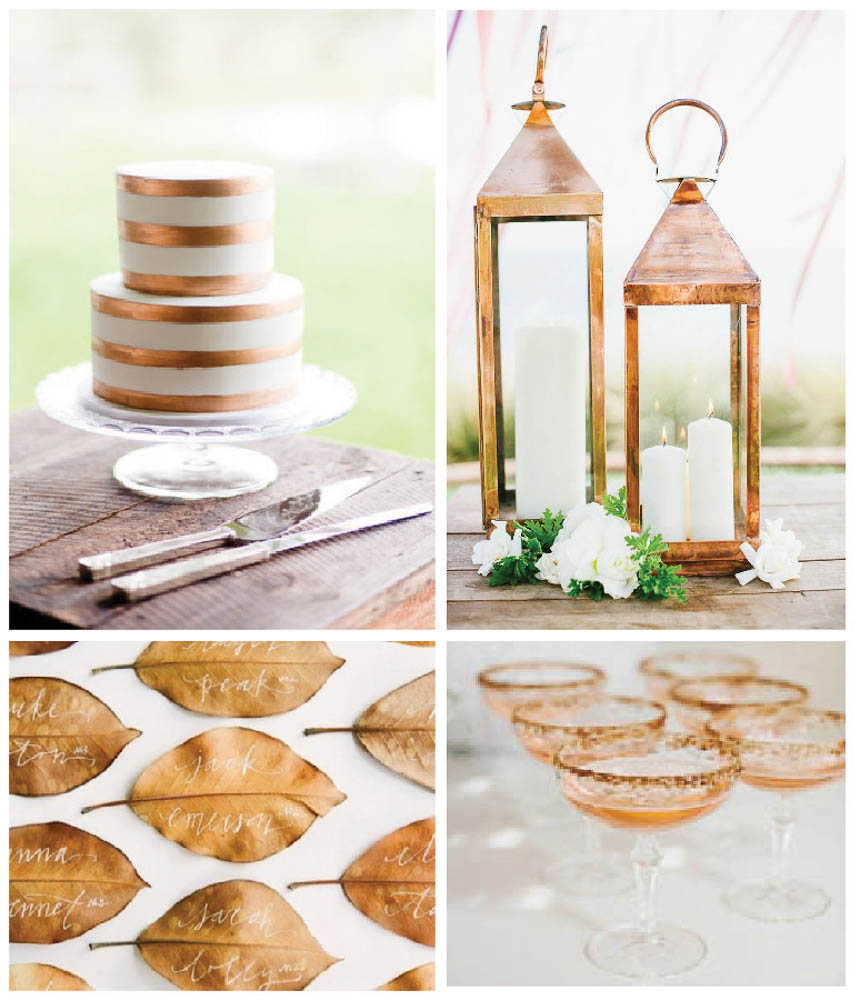 Copper, or as Chemists say Cu, is an essential though often sadly neglected, component of our life. This malleable metal is often used as a building material due to it’s innate properties as a conductor of heat and electricity—which is perhaps why we overlook it so often (I mean how many of us really bend over to pick up the dropped penny on the street?). Copper is a naturally occurring metal, found in some of the oldest civilizations on Earth, with traces being used as far back as 10,000 years ago. During the Bronze Age about 4,000 years ago several cultures smelted copper to make bangles, pottery, artwork, and tools. However, with it’s beautiful reddish-orange natural color finish (and ability to be flexible in high stressed and high temperature situations), it is no surprise that incorporating flares or inspiration of copper has found it’s way into the wedding scene and décor—or the new age of copper.