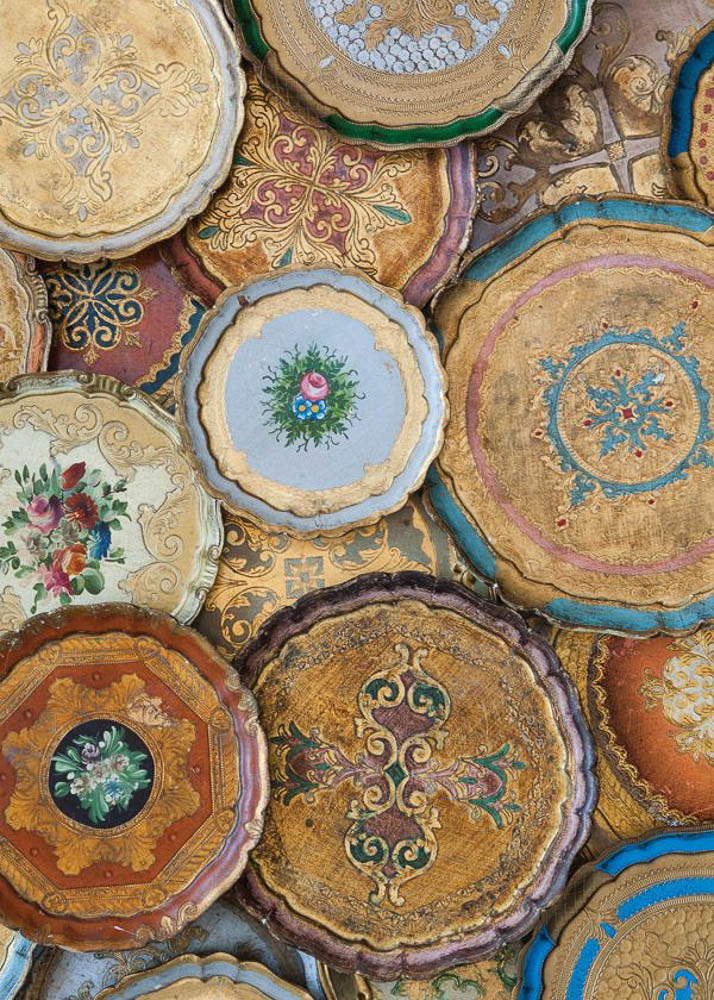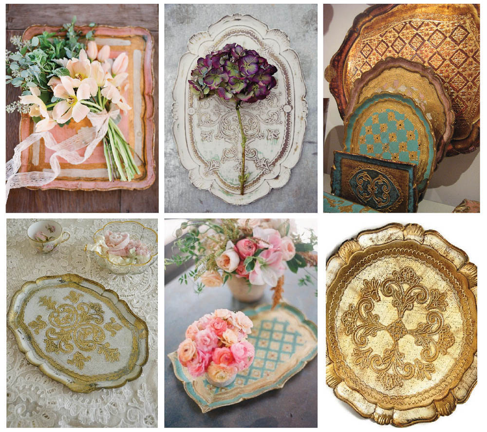 Art enthusiasts and novices alike flock to and cherish these now traditional pieces and styles. They conjure quintessential and idyllic beauty, with a flawless technique. A modern take and incorporation of this period is through the increasingly popular Florentine Trays. Located in antique shops and flea markets throughout Europe, these Italian vintage pieces are nothing short of beautiful masterpieces. Carved out of high quality wood, and crafted to perfections with layers of paint and decorations, these gorgeous platters add timeless detail to your targeted wedding decor.