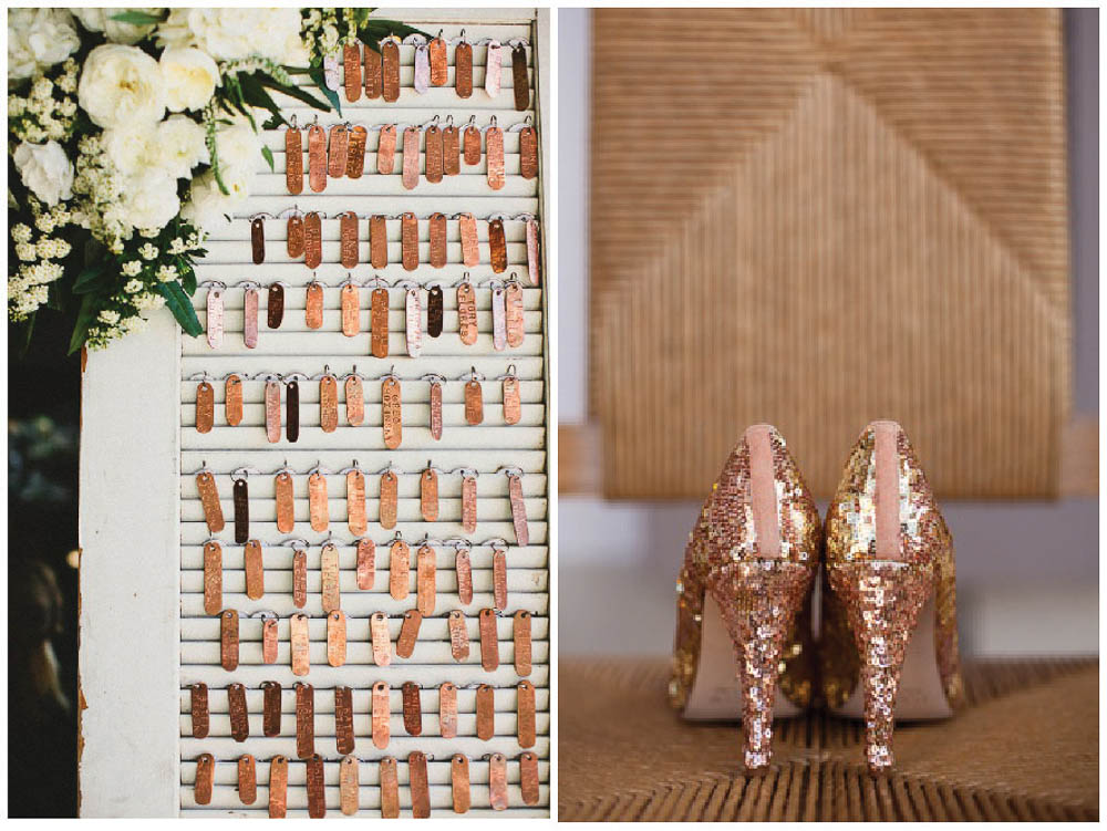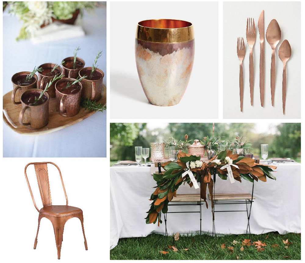 Copper, or as Chemists say Cu, is an essential though often sadly neglected, component of our life. This malleable metal is often used as a building material due to it’s innate properties as a conductor of heat and electricity—which is perhaps why we overlook it so often (I mean how many of us really bend over to pick up the dropped penny on the street?). Copper is a naturally occurring metal, found in some of the oldest civilizations on Earth, with traces being used as far back as 10,000 years ago. During the Bronze Age about 4,000 years ago several cultures smelted copper to make bangles, pottery, artwork, and tools. However, with it’s beautiful reddish-orange natural color finish (and ability to be flexible in high stressed and high temperature situations), it is no surprise that incorporating flares or inspiration of copper has found it’s way into the wedding scene and décor—or the new age of copper.